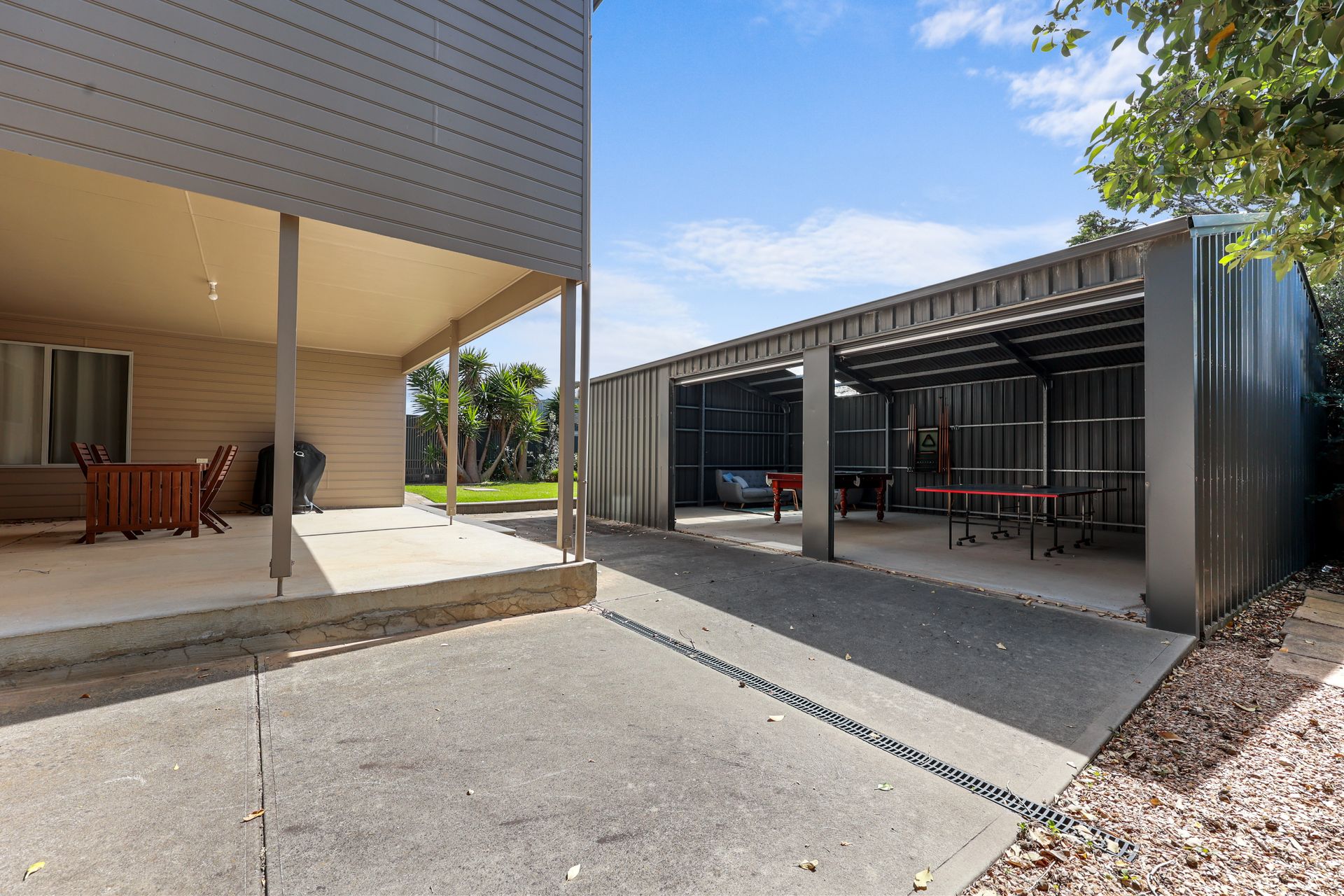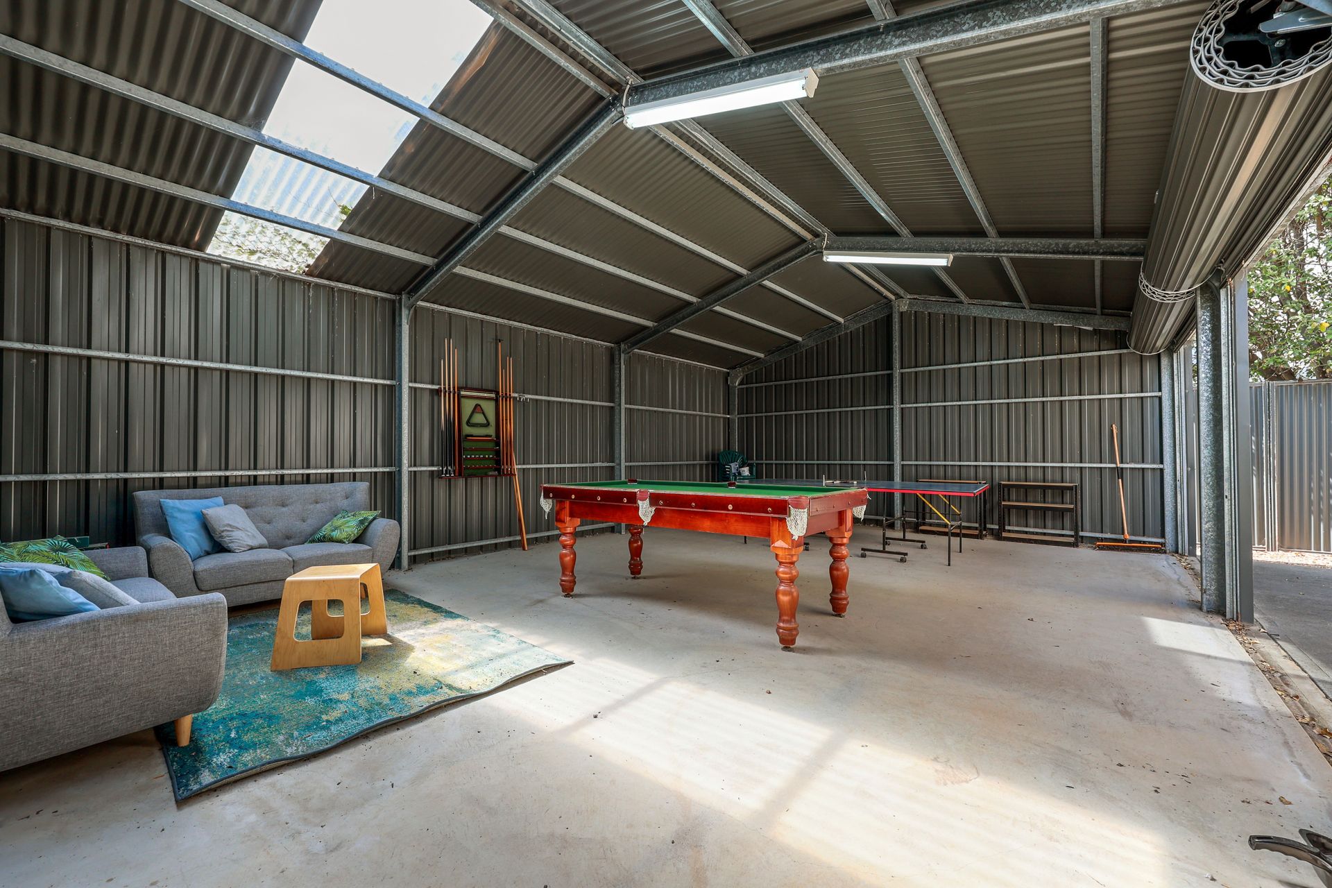 Beyond the main living area, your stay is enhanced by dedicated entertainment spaces: you have access to the secure three-car garage and a fantastic rear games shed! This shed is the ultimate spot for fun, equipped with a pool table, table tennis, and comfortable lounges.