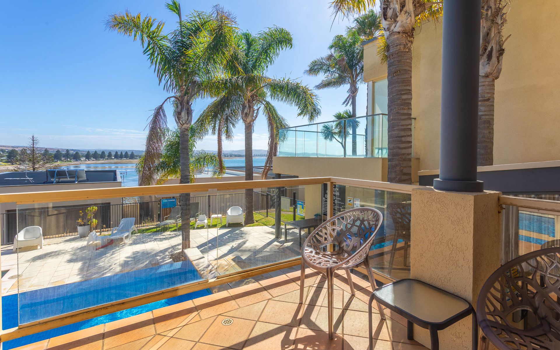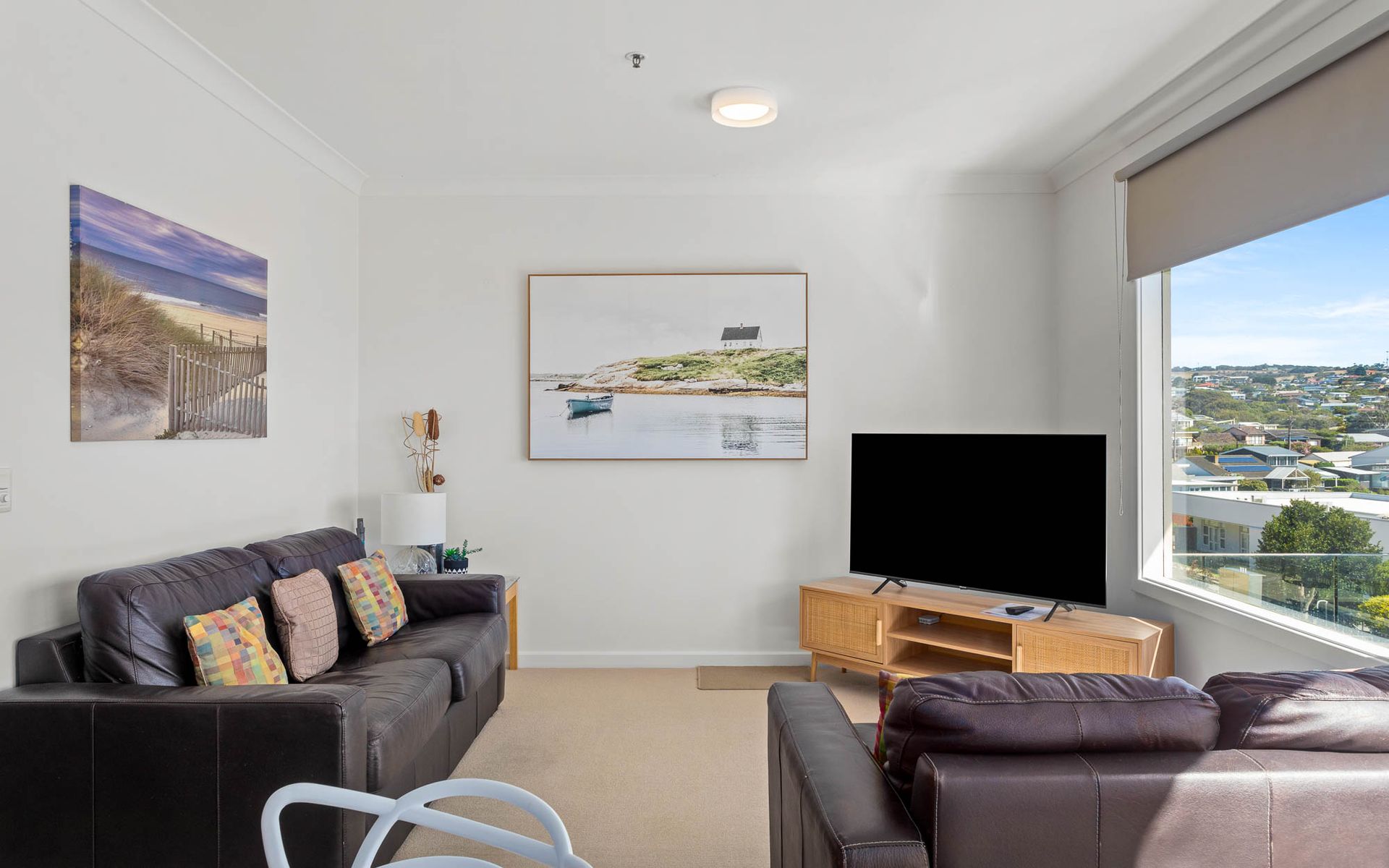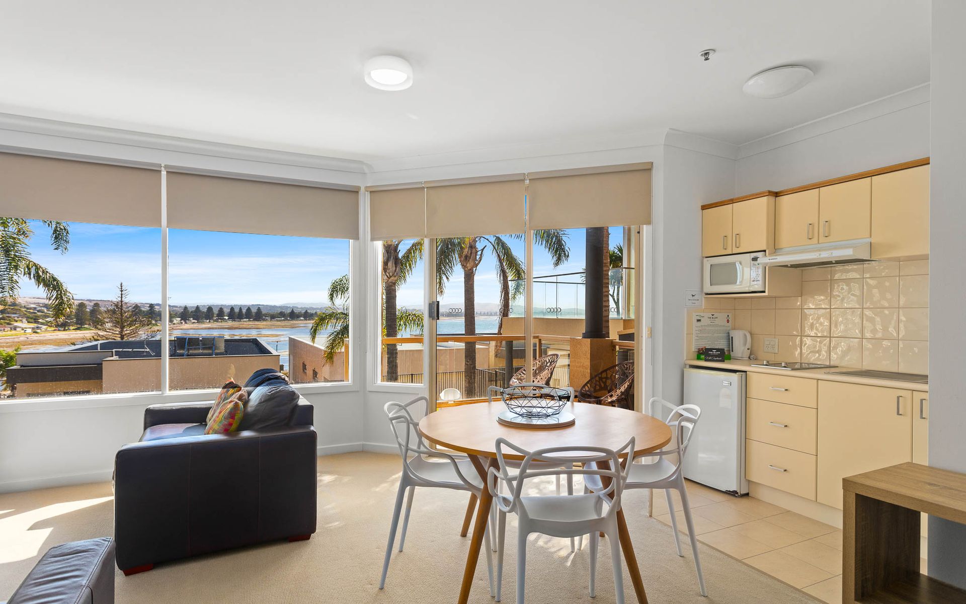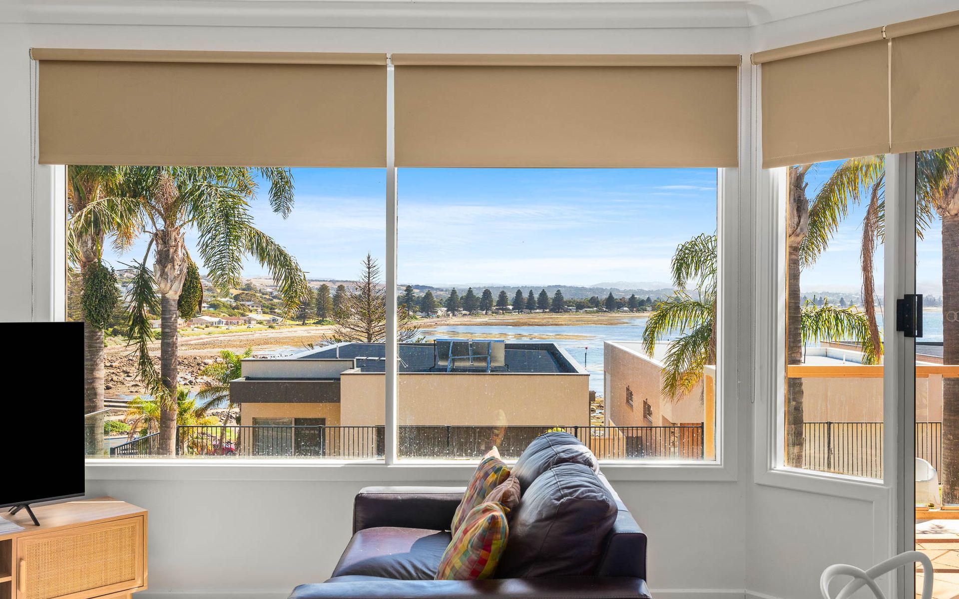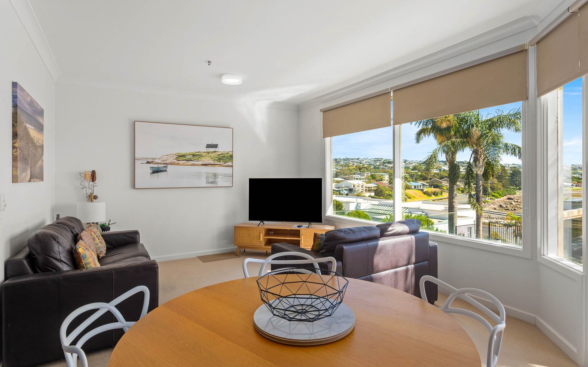 Step into the inviting living area, which opens onto a private balcony where you can soak in the panoramic ocean views. Feel the refreshing sea breeze on your face as you sip your morning coffee, and in the evenings, lose yourself in the magic of an unforgettable Encounter Bay sunset.