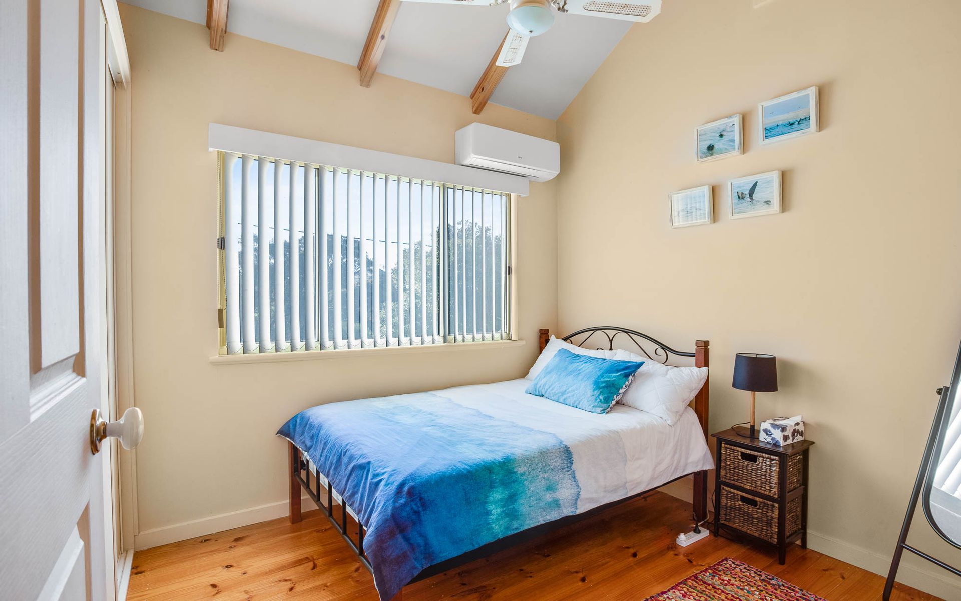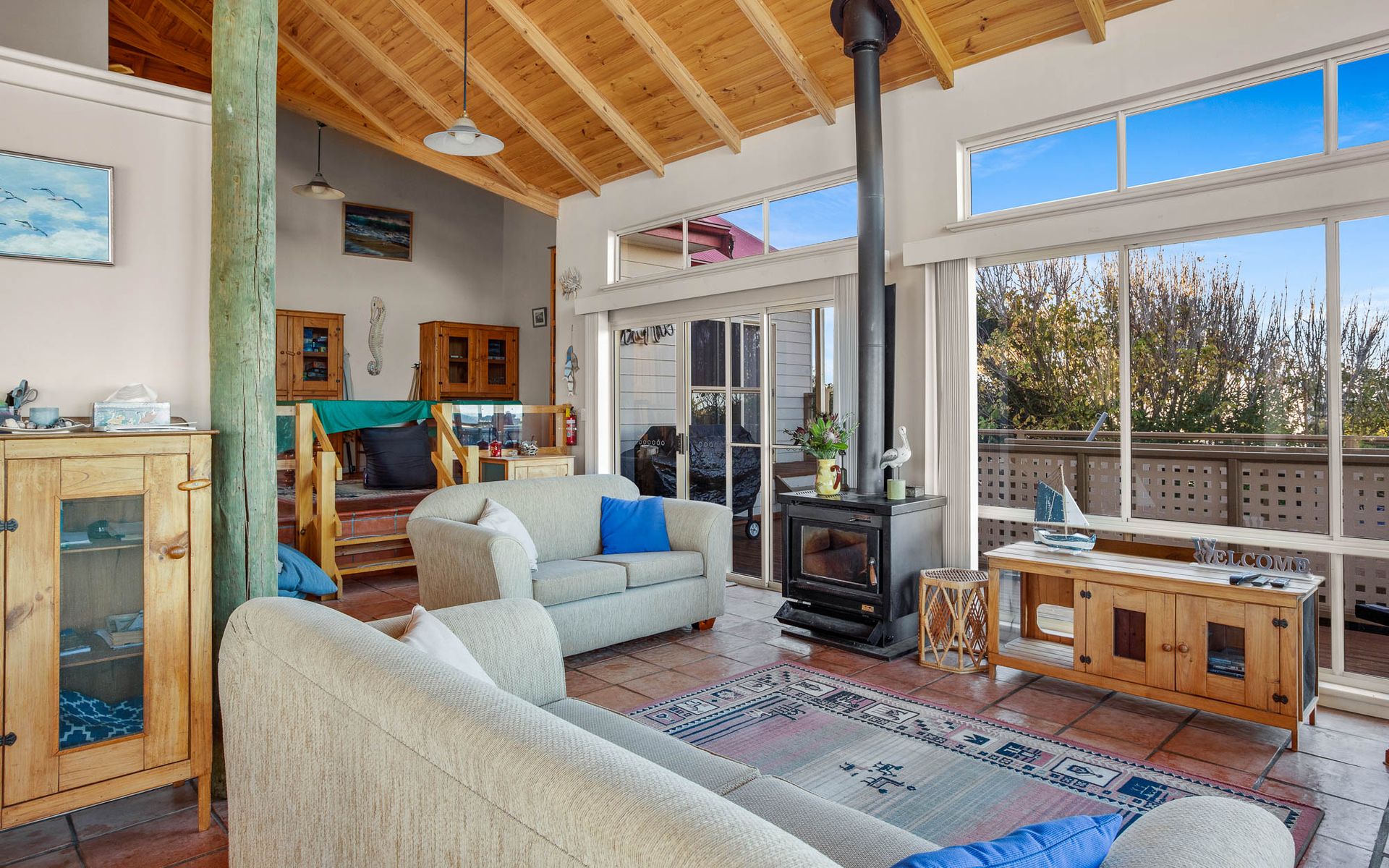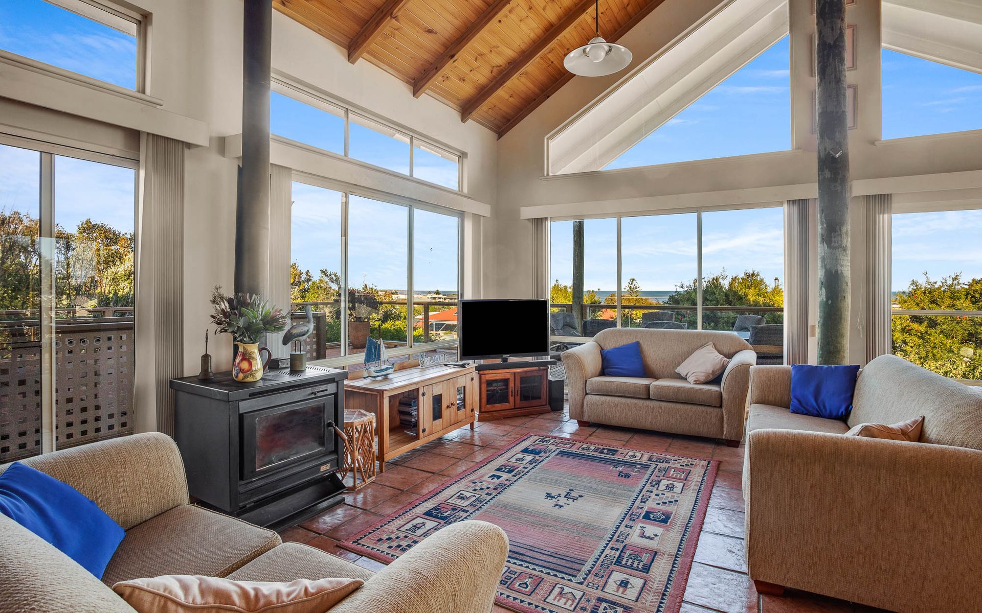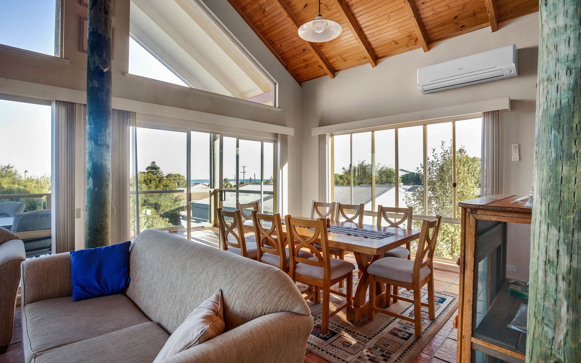 Freshen up in our modern bathroom, equipped with a walk-in shower and hairdryer for guest use. Step outside to our outdoor entertaining area, where you can marvel at the stunning ocean views and create cherished memories with your loved ones. While our home features a combustion fire, it is not available for guest use. However, air conditioning ensures year-round comfort for all.