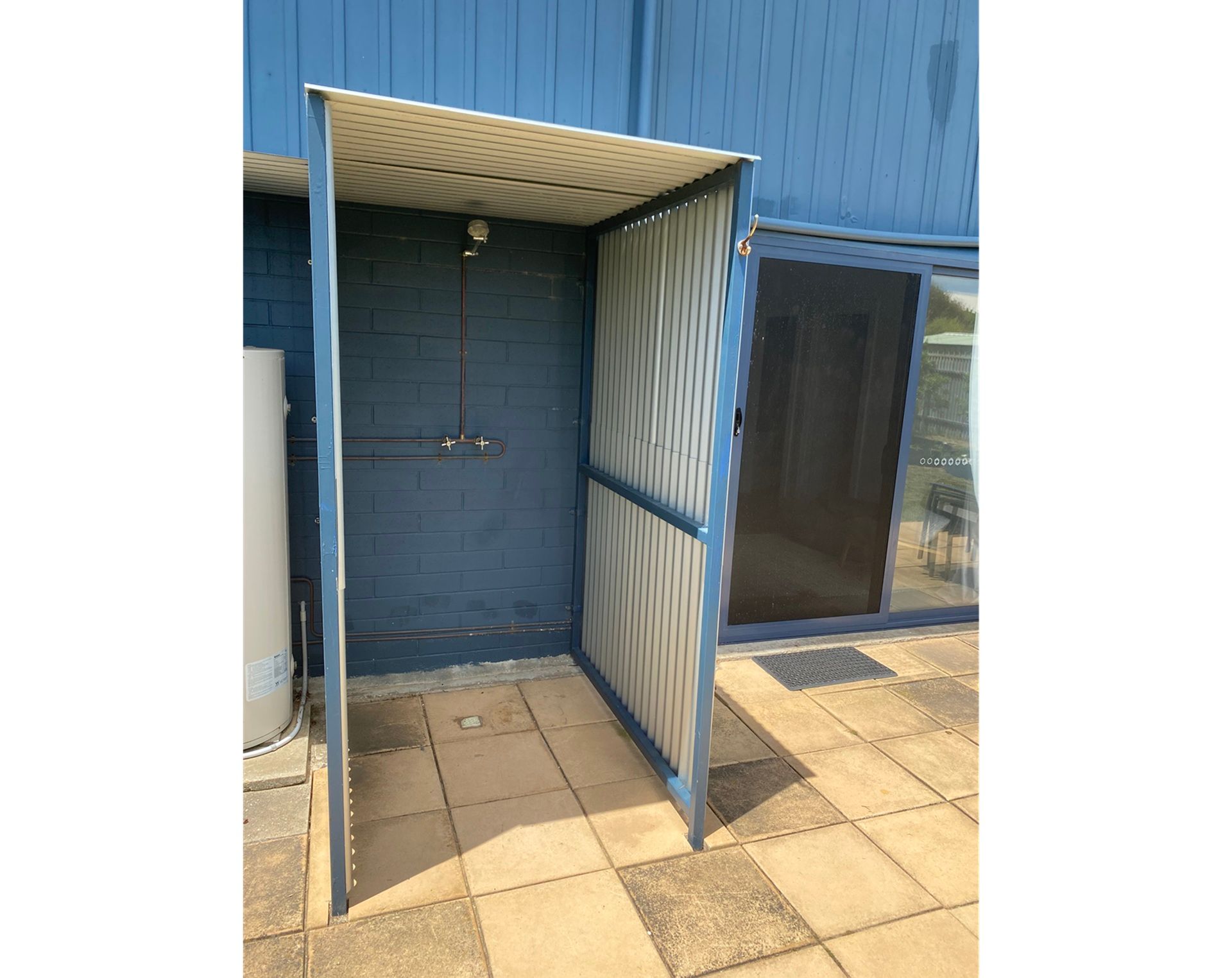 Outside: - A large backyard with an outdoor shower offering both hot and cold water.