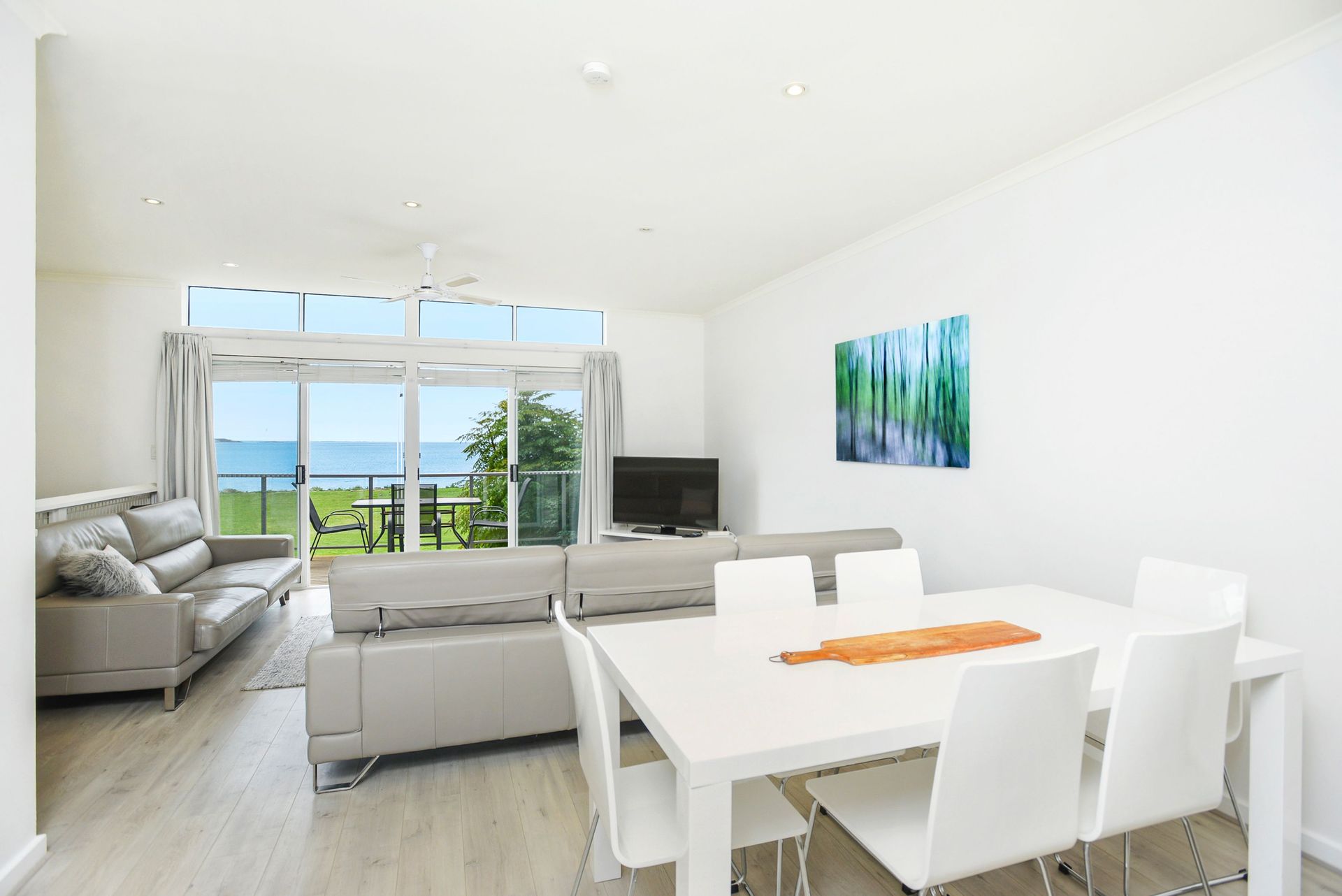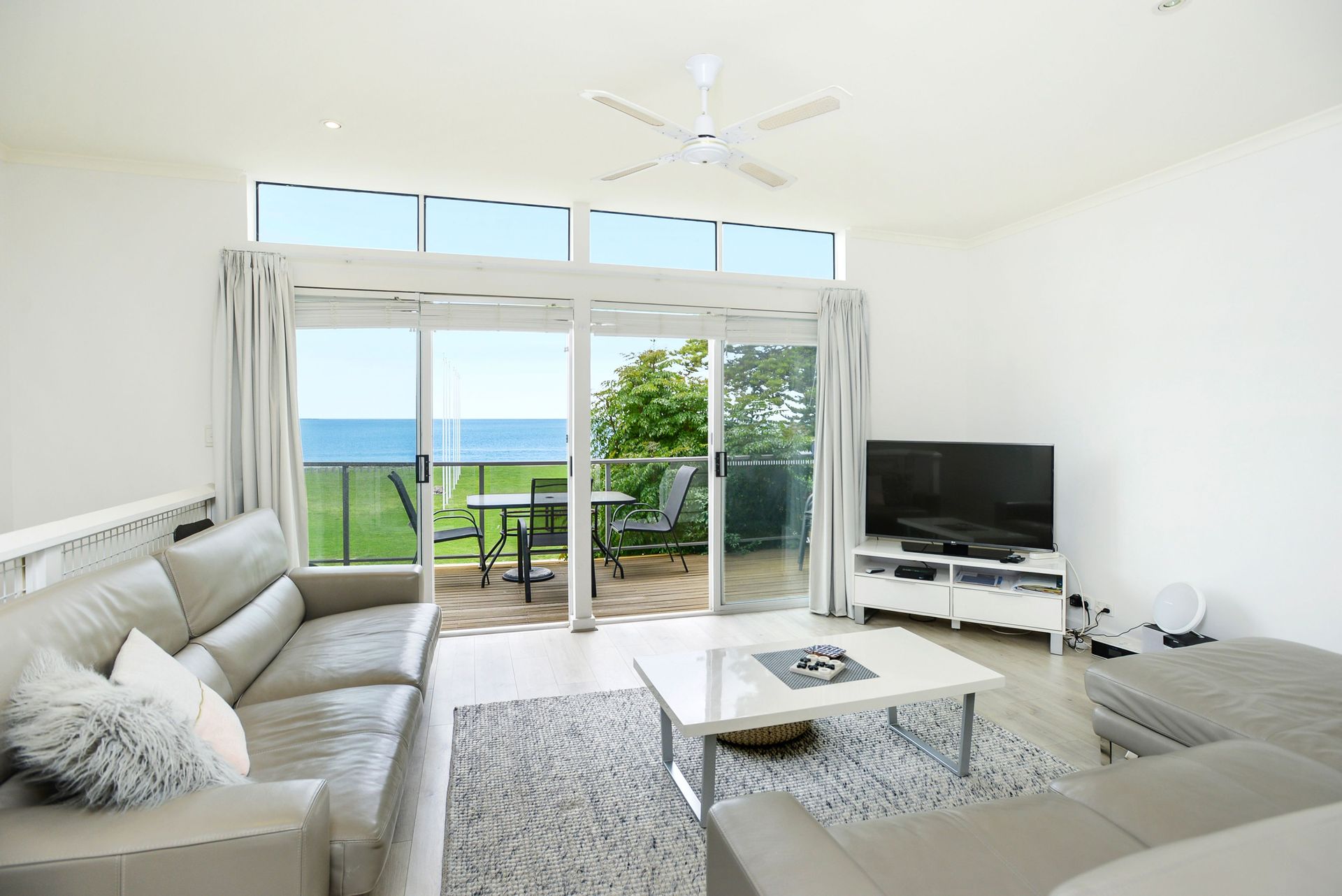 This fabulous, newly renovated beachfront townhouse has superb sea views from the balcony, kitchen, dining and living areas. Large balcony with outdoor setting, alfresco umbrella and BBQ. Modern throughout. Fully equipped kitchen with microwave, dishwasher and plumbed water filter. Dining and living area with flat screen TV, ipod dock and reverse cycle air conditioner. One queen bedroom upstairs, separate toilet and vanity.